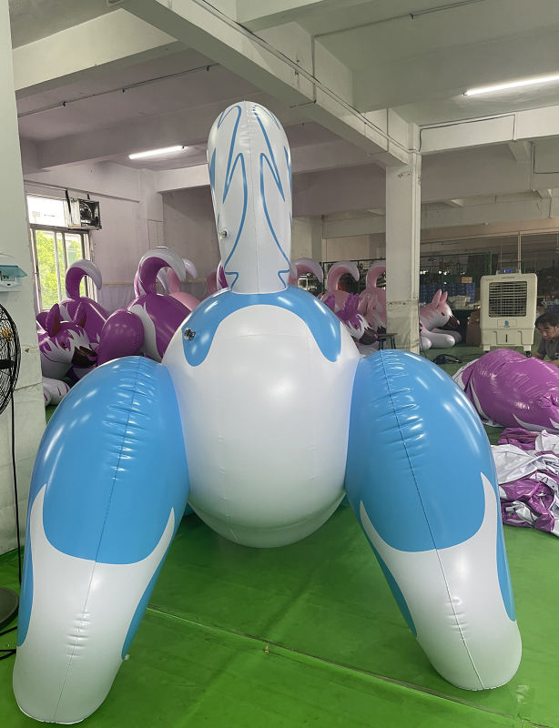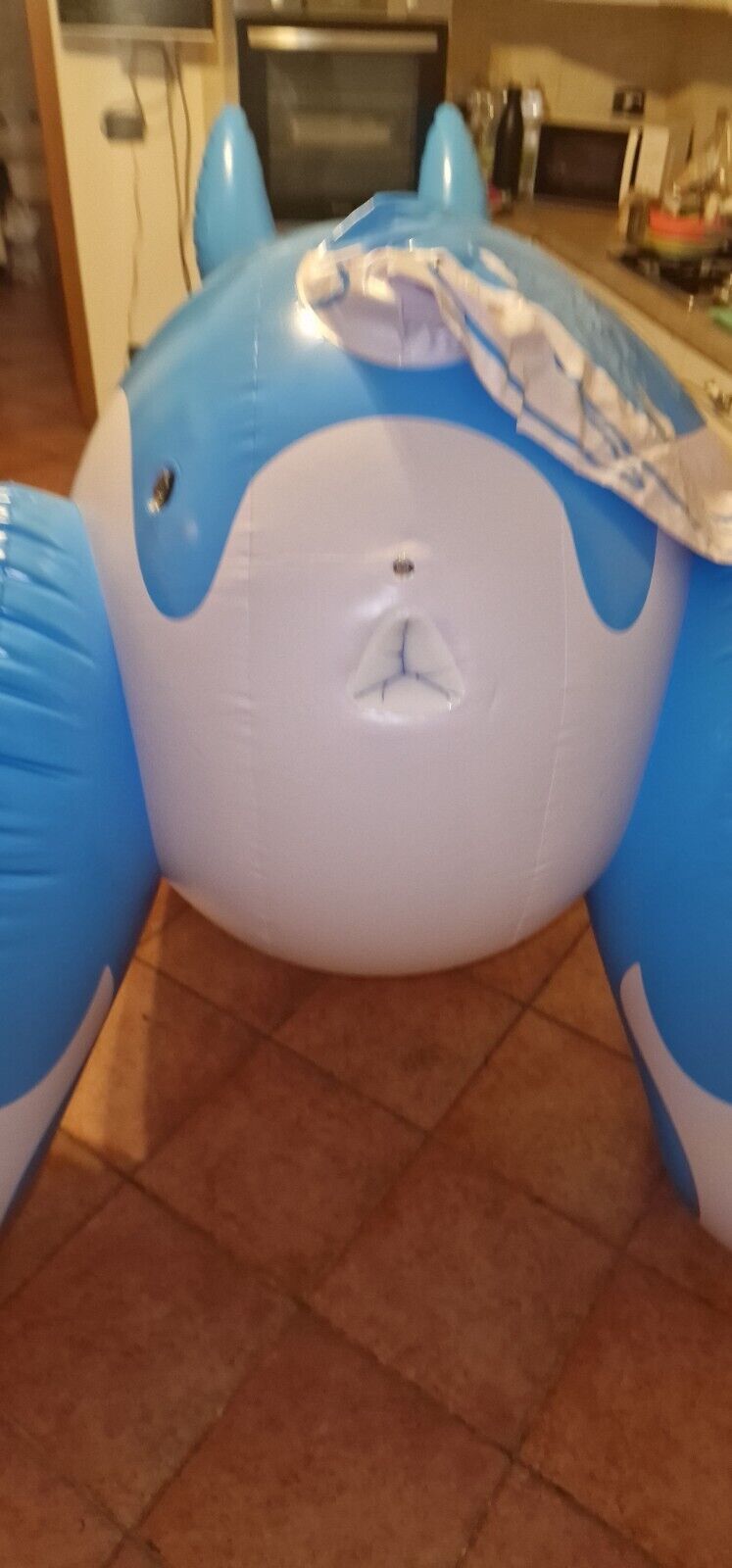 This is a really big toy, it's actually over 2.5m long when inflated. I got the Blue version, this might not be a lifelike colour but it certainly looks good. There's just one problem with riding this toy, the back legs are straight and so lift the backside well of the ground. So when you sit on it you just slide down to a point at the back of the neck. The only way to sit in the middle of the back is to partly deflate the back legs, then the body sits on the ground. A bit of re-thinking is needed to make this toy more rideable.